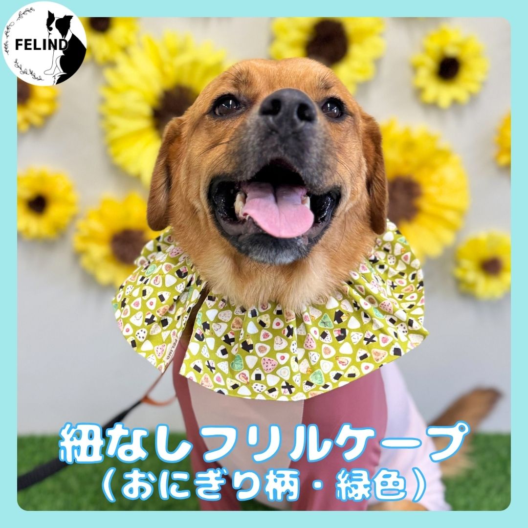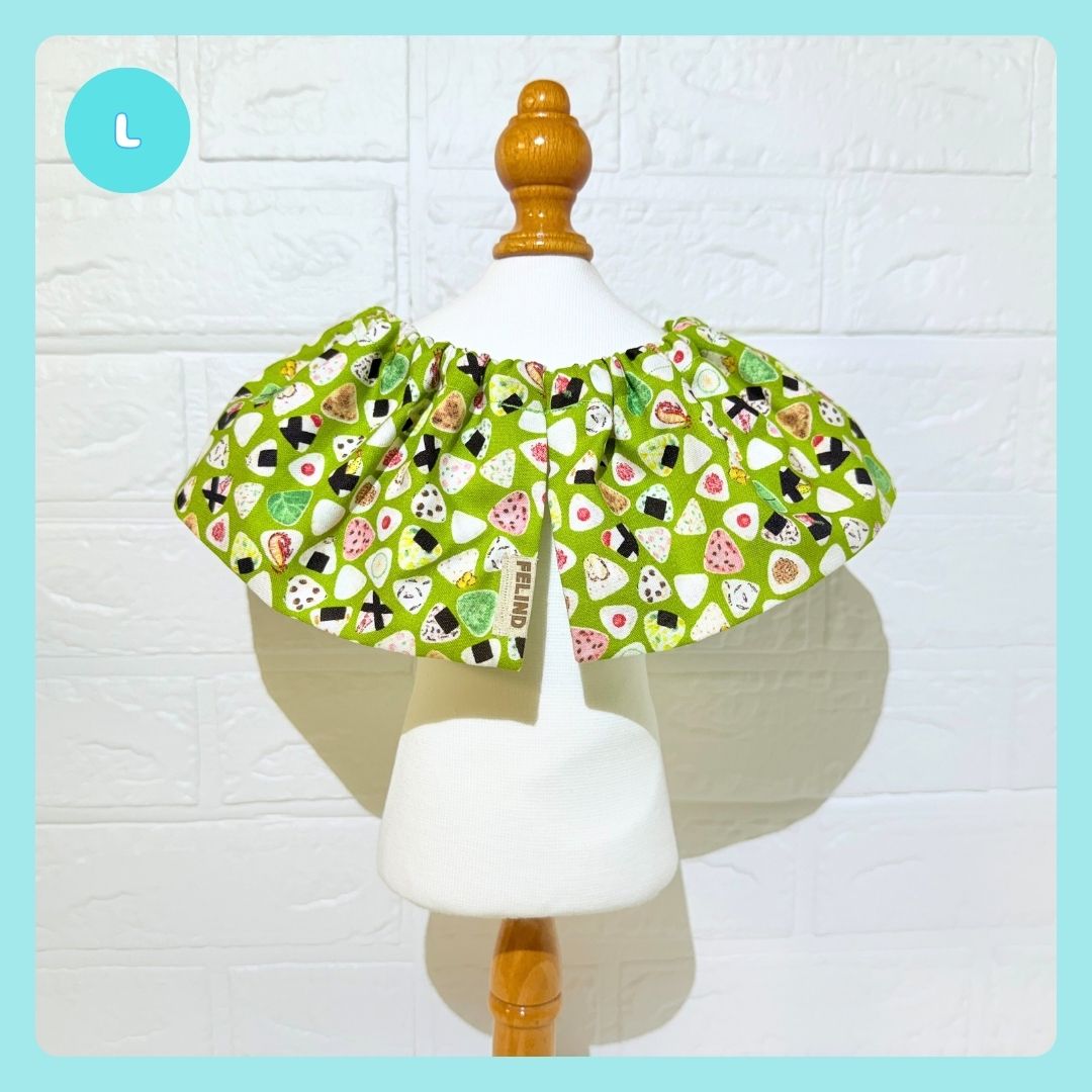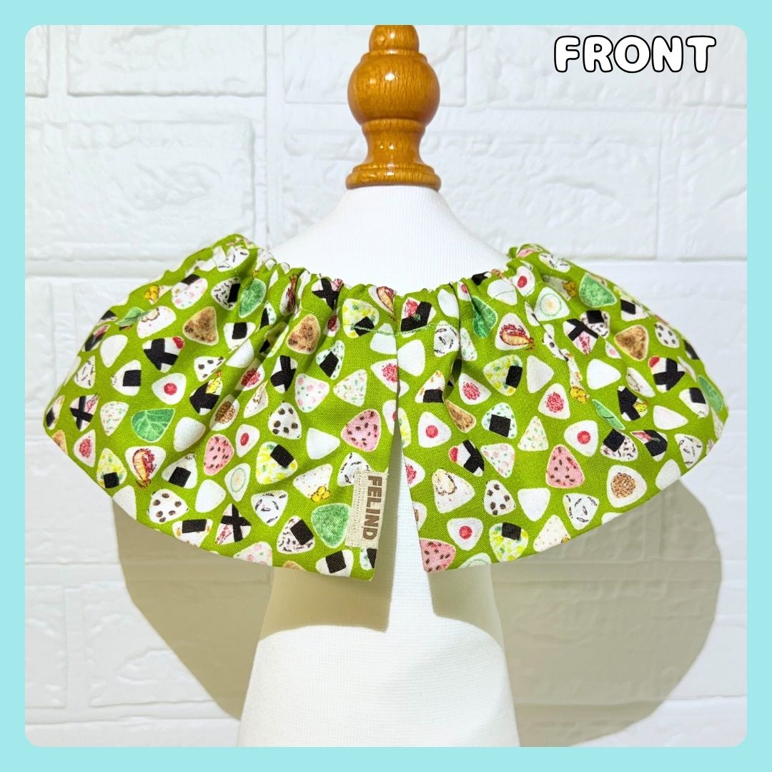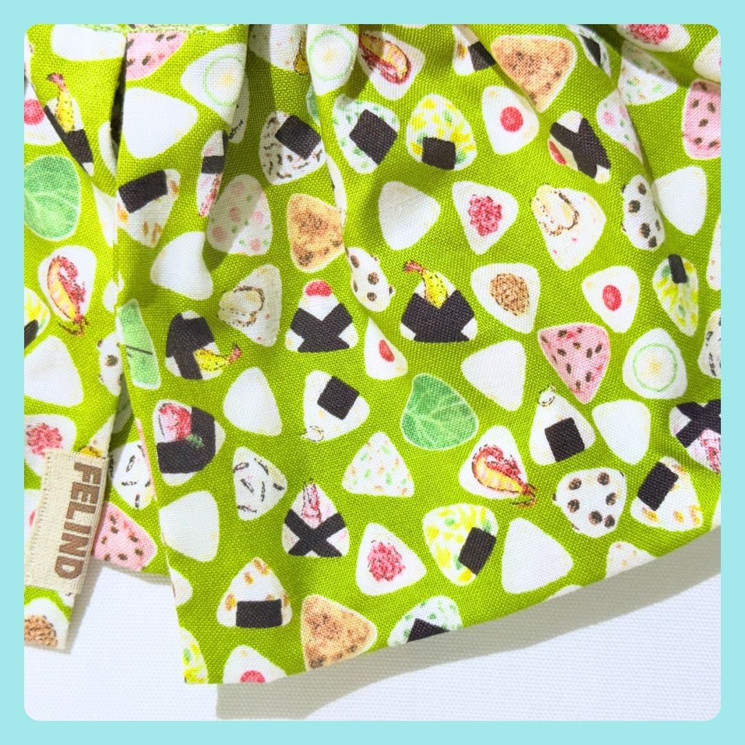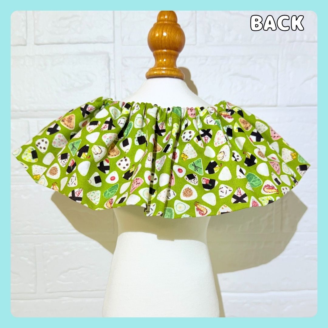 おにぎり柄の緑色の生地が可愛らしいケープです♪